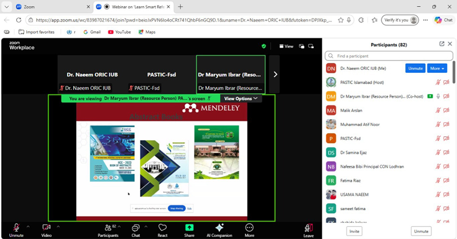 A webinar titled “𝗟𝗲𝗮𝗿𝗻 𝗦𝗺𝗮𝗿𝘁 𝗥𝗲𝗳𝗲𝗿𝗲𝗻𝗰𝗲 𝗠𝗮𝗻𝗮𝗴𝗲𝗺𝗲𝗻𝘁 𝘄𝗶𝘁𝗵 𝗠𝗲𝗻𝗱𝗲𝗹𝗲𝘆” was organized by the Office of Research, Innovation and Commercialization (ORIC), The Islamia University of Bahawalpur (IUB), in collaboration with the Pakistan Scientific and Technological Information Centre (𝗣𝗔𝗦𝗧𝗜𝗖), 𝗼𝗻 𝗔𝗽𝗿𝗶𝗹 𝟵, 𝟮𝟬𝟮𝟲, 𝗮𝘁 𝟭𝟬:𝟬𝟬 𝗔𝗠.